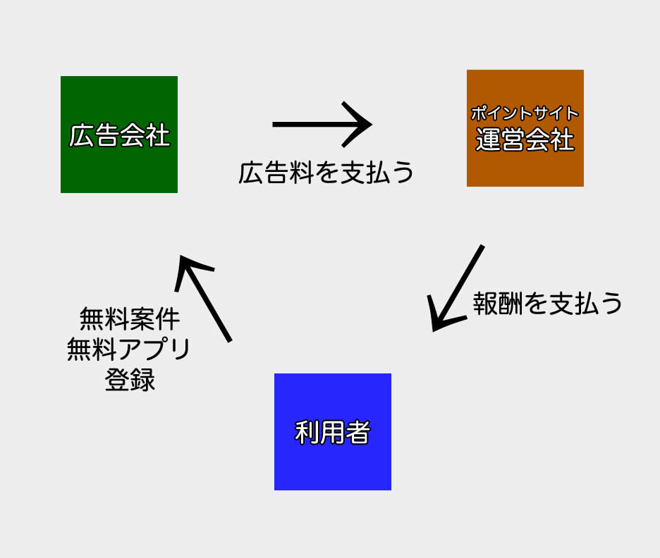 "うまい話には裏がある"と言いますが、私たち利用者が無料アプリをダウンロードしたとします。そのアプリ内にある広告をクリックしたり表示されると広告主からポイントサイト運営会社に報酬が支払われます。 その報酬の中からポイントサイト運営会社は私たち利用者に報酬を還元する仕組みとなっています。